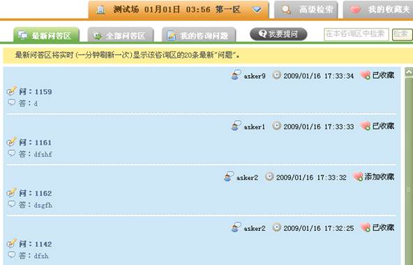 其中,在问答界面内,分三种类别对问题列表进行显示。其中包括最新问答区(即在您所在场及工作单位内的最近问题及回答区域系统会自动刷新为您获取最新的20条问题列表)、全部问答区(即显示全部问题和回答以及提问者和提问时间)、我的咨询问题(即显示您在本咨询区域所提问题以及回答)。您可以根据您的需要选择不同的显示方式。
