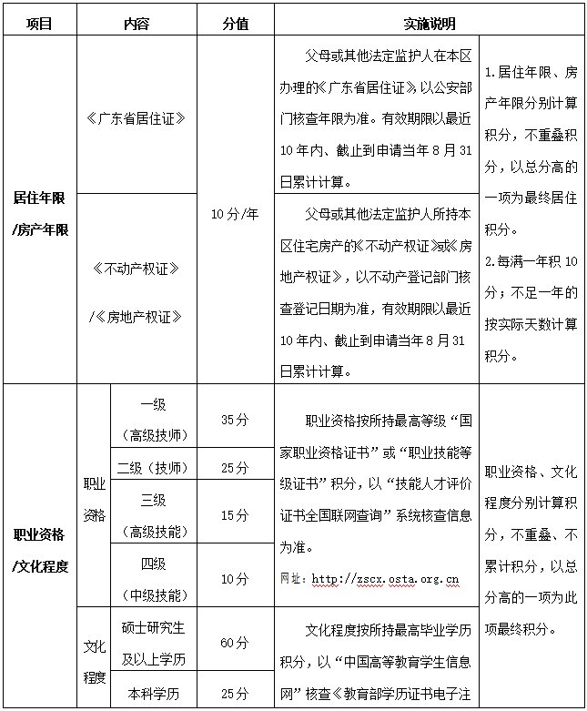 居住年限(或房产年限)积分。居住年限,父母或其他法定监护人在本区办理《广东省居住证》,以公安部门核查年限为准,有效期限以最近10年内、截止到申请当年8月31日累计计算;房产年限,父母或其他法定监护人所持本区住宅房产的《不动产权证》或《房地产权证》,以不动产登记部门核查登记日期为准,有效期限以最近10年内、截止到申请当年8月31日累计计算。