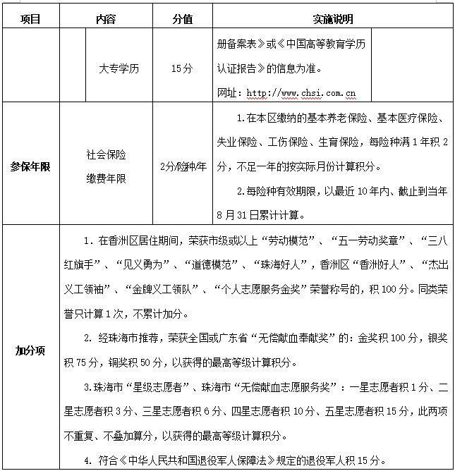 珠海香洲区异地务工人员随迁子女积分入学指标及分值表