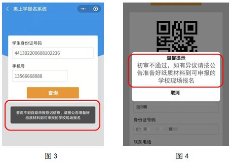 1.如查询结果如图3或图4所示,(1)请再次检查输入的“学生身份证号码”和“手机号”是否正确→(2)如核实无误仍出现图3或图4的结果,则请家长认真对照公告第二条“适用对象”的条件确认子女是否符合申报条件→(3)如符合申报条件则请带齐证件原件及复印件(即公告第三条“申请填报”中现场申请的材料)到申请转入的学校(第一志愿学校)现场申请。