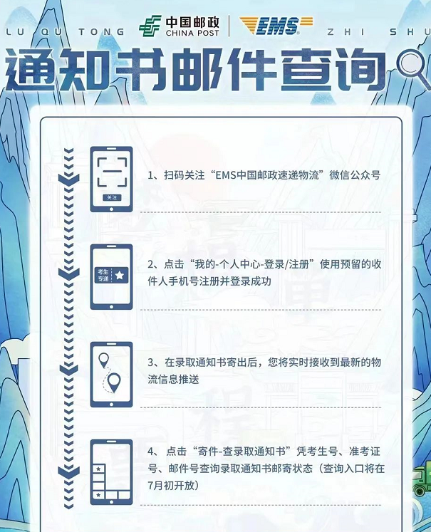 考生可按照下方【通知书邮件查询】流程查询录取通知书物流信息,凭考生号、准考证号、邮件号查询录取通知书发放、投递、寄达时间,及时获取录取通知书物流信息。