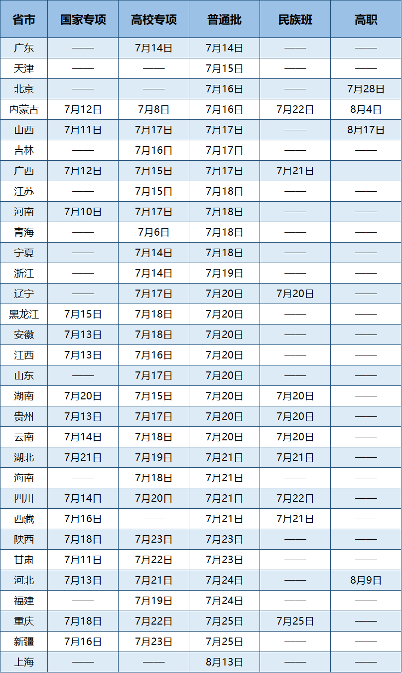 2.以下仅公布国家专项、高校专项、普通批、民族班和高职(专科)录取预计开始时间,其余类型招生录取请以各省招办投档时间为准。