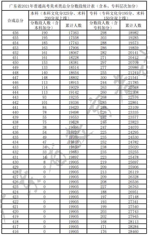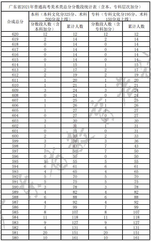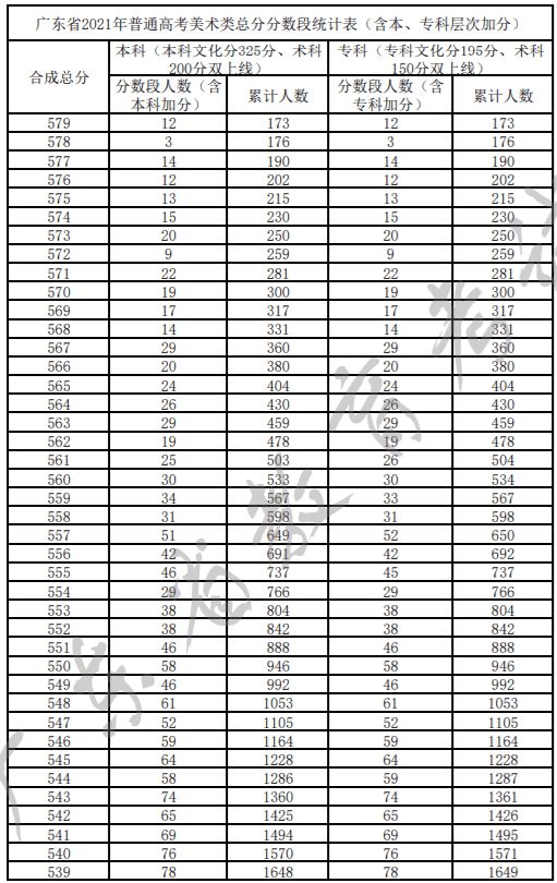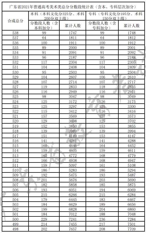 广东省2021年普通高考美术类总分分数段统计表(含本、专科层次加分)