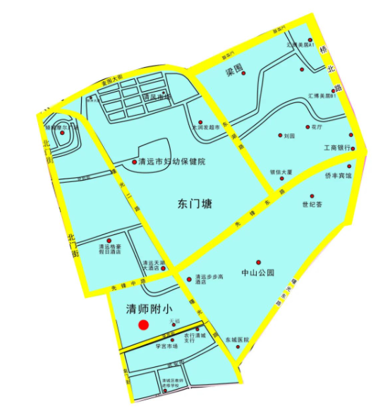 、华中路、南埗路、振南街(西至永安北路止)、连江西路以北(西至永安北路止)、永安北路以东(南至连江西路止)、南大街(东至华中路,西至永安北路)、南大街以北(东至永安北路,西至62号楼止)、北江三路(倚江楼、清远海关、第一海岸、发展行、星河明居、海岸公馆)