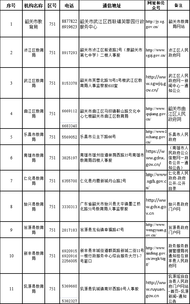 ➤韶关市各教师资格认定机构联系方式: