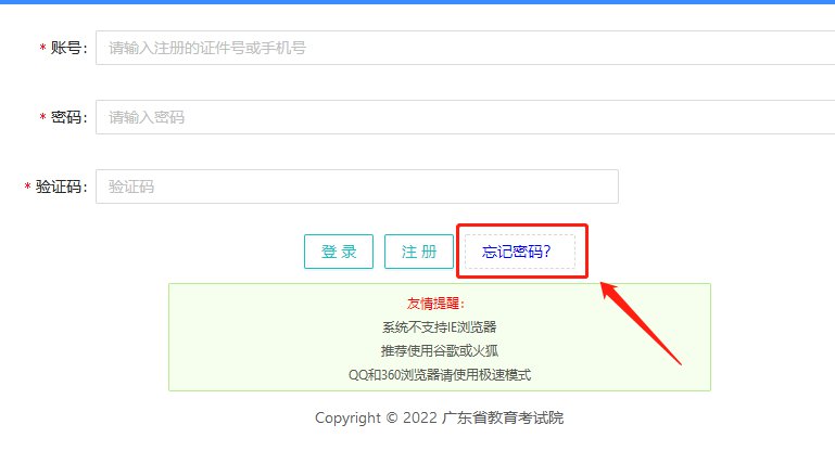 1、考生密码遗忘,可通过广东省普通高考/学考报名系统的考生端(https://pg.eeagd.edu.cn/ks)凭手机短信验证码进行密码重置;