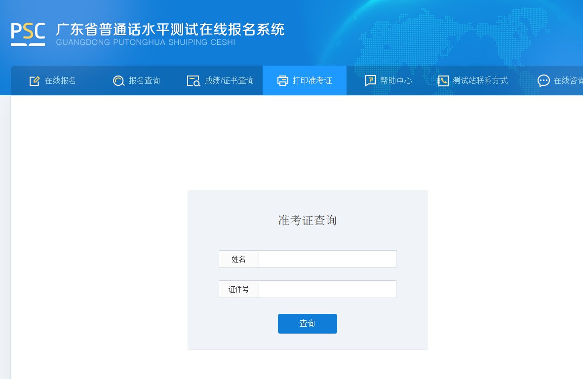 登录广东省普通话水平测试在线报名系统,查看报名情况并打印准考证。