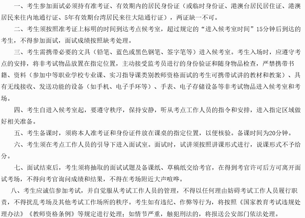 考生如不遵守考场规则,不服从考试工作人员管理,有违规行为的,将按照《国家教育考试违规处理办法》和《教师资格条例》有关规定处理。如在考试过程中有组织作弊、代替他人或者让他人代替自己参加考试等涉嫌违法犯罪行为的,将根据《中华人民共和国刑法修正案(九)》的规定,移送司法机关追究刑事责任。