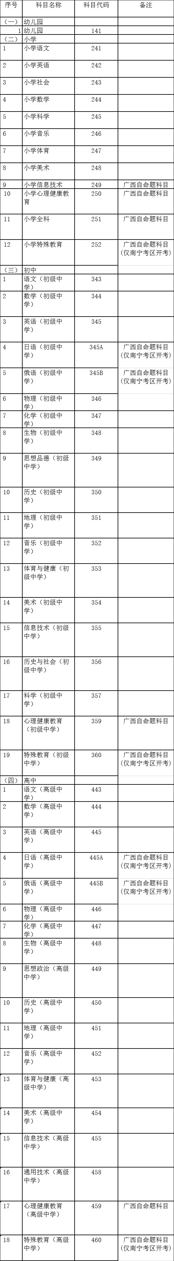 (1)广西2021年上半年中小学教师资格考试面试开设的科目见附件4。小学信息技术、小学心理健康教育、小学全科、小学特殊教育、日语(初级中学)、俄语(初级中学)、心理健康教育(初级中学)、特殊教育(初级中学)、日语(高级中学)、俄语(高级中学)、心理健康教育(高级中学)、特殊教育(高级中学)为广西自命题科目,笔试公共科目201、202或301、302合格的考生,可选择报考相应的科目。
