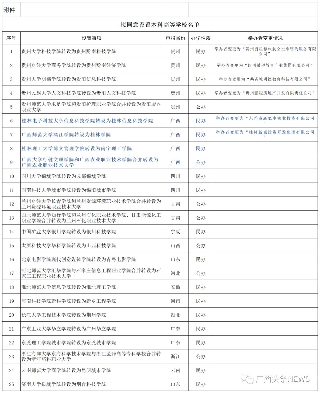 教育部官网显示:根据《高等教育法》《普通高等学校设置暂行条例》《普通本科学校设置暂行规定》和《关于加快推进独立学院转设工作的实施方案》等法律法规政策规定,经第七届全国高等学校设置评议委员会专家考察和评议,并经党组会审议,拟同意贵州大学科技学院等25所独立学院转设为独立设置的本科学校,现将学校名单等信息向社会公示。