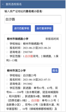 点击“自行查询学校”,选择该学校所辖城区教育局,找到对应学校,点击“报名”。