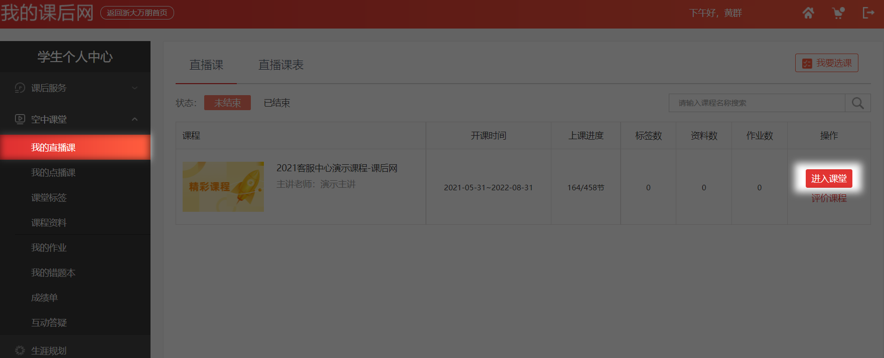 根据课程表时间,提前30分钟登录,进入“学生个人中心” → 点击“我的直播课”→选择相应课程点击“进入课堂”。