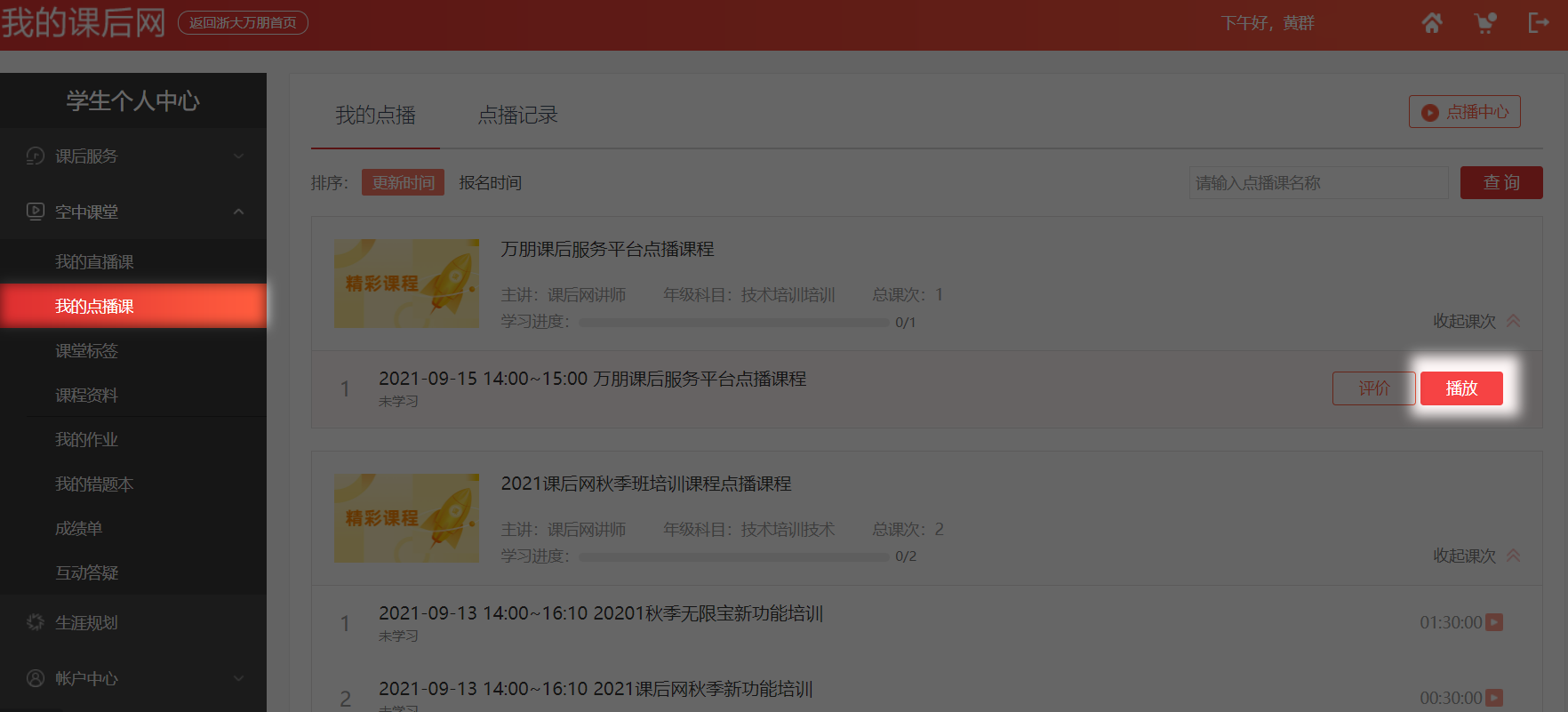 如果有点播课程,则可以在有效期时间内点击“我的点播课”,进入点播中心选择课次进行点播听课。