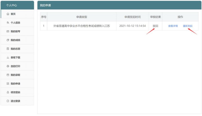 8、提交申请后可再次从“我的申请”进入“外省普通高中学业水平合格性考试成绩转入江苏”申请页面点击“点击进入”查看“审核结果”进度。