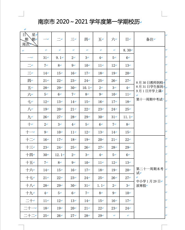 2020年7月11日,南京市教育局公布2020~2021学年度校历