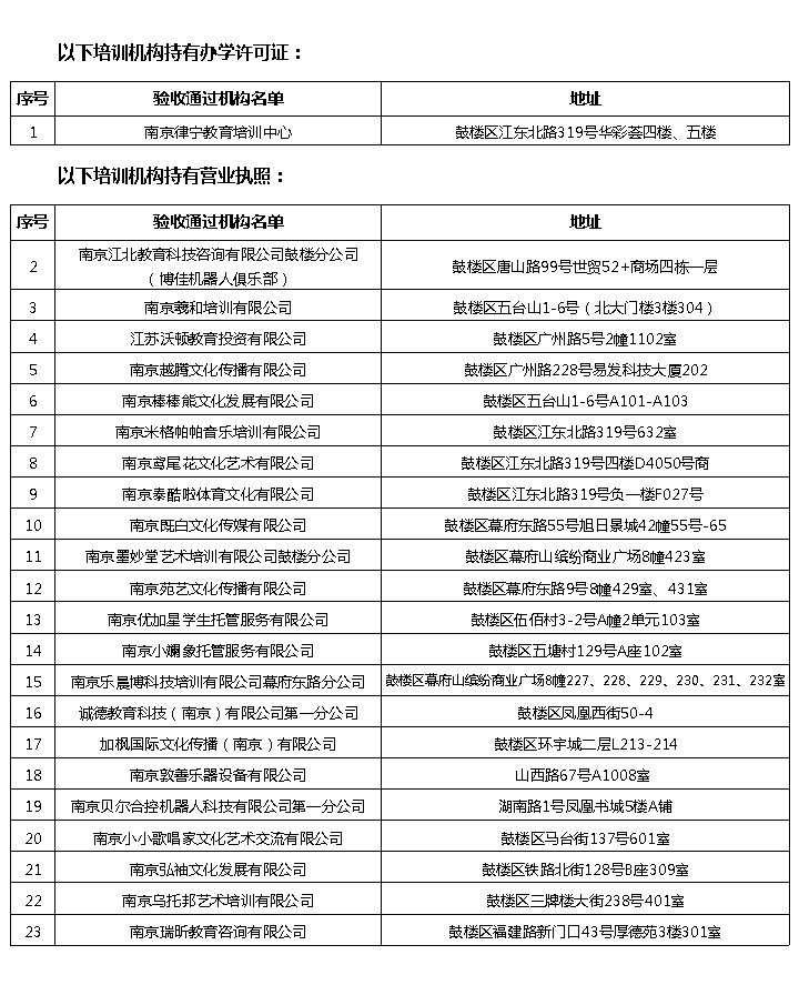 按照省市疫情防控指挥部统一部署,近期鼓楼区联防联控工作指挥部学校组组织相关部门和属地街道对已申请线下复课的社会培训机构(托育机构)进行了督查验收,现将第十一批通过验收的社会培训机构(托育机构)名单公示如下: