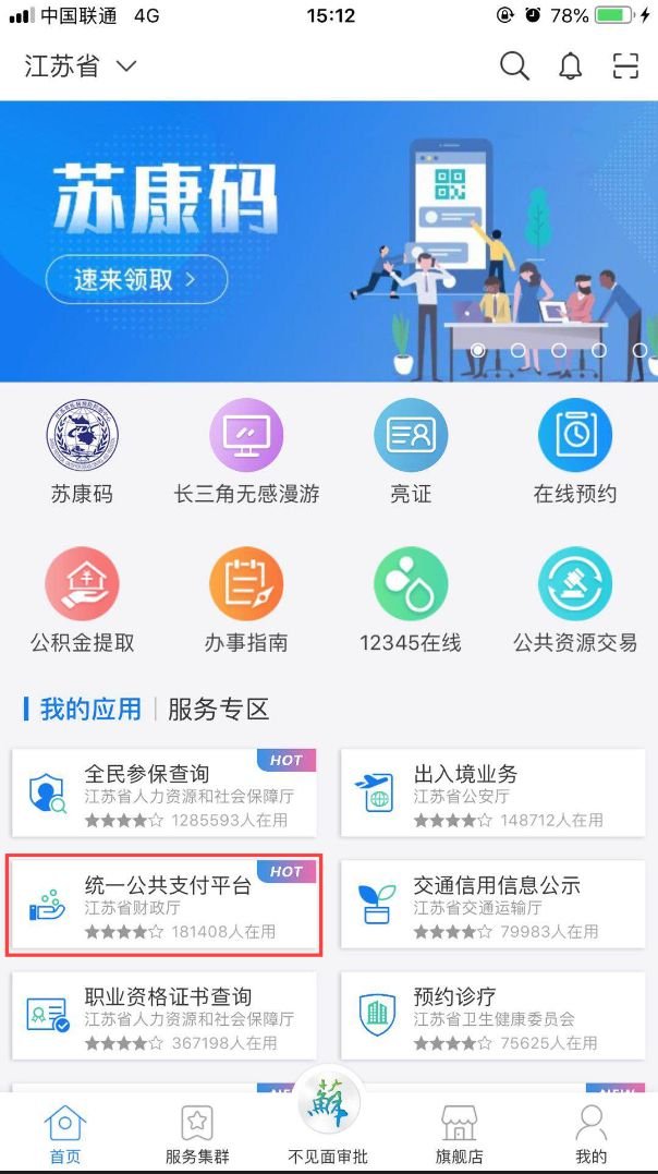第一步:进入江苏政务服务网后选择“统一支付平台”缴费入口,需实名登陆。