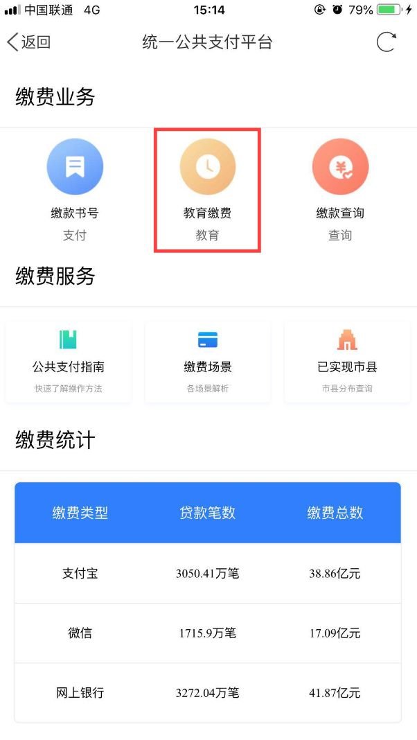第二步:进入统一支付平台后选择“教育缴费”。