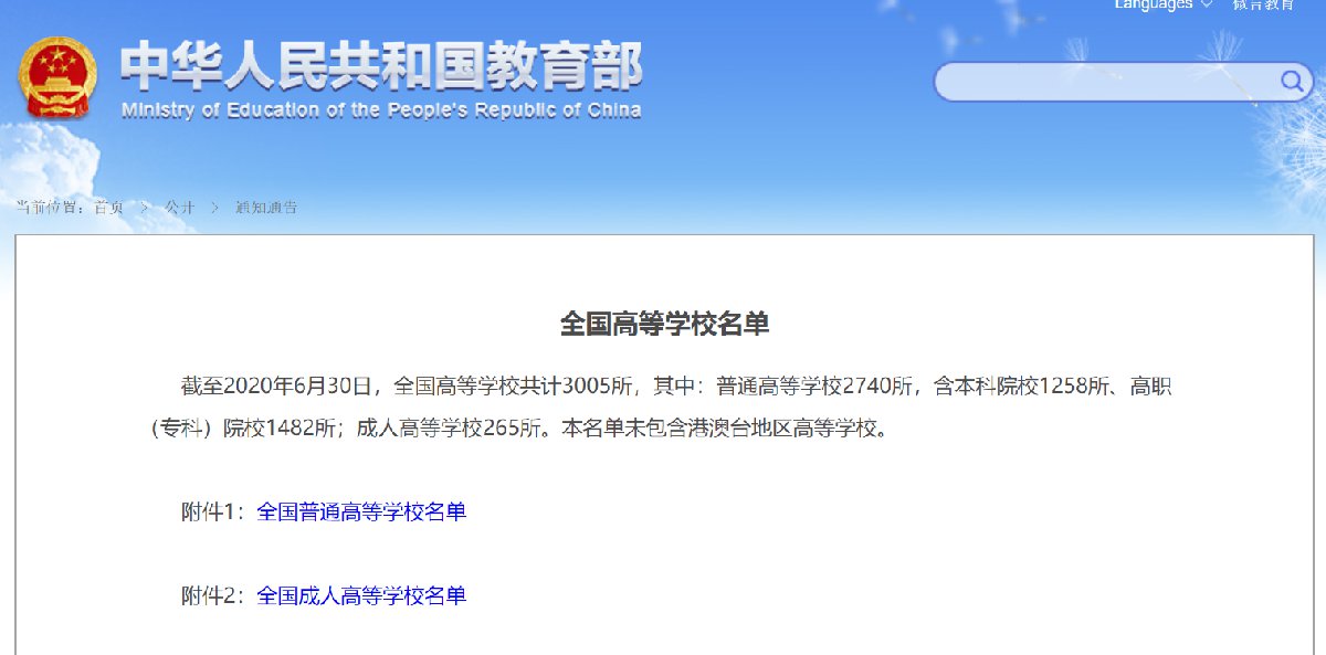 教育部于2019年7月9日发布《全国高等学校名单》(简称《名单》)。截至2020年6月30日,全国高等学校共计3005所(未包含港澳台地区高等学校)。其中,普通高等学校2740所,含本科院校1258所、高职(专科)院校1482所;成人高等学校265所。