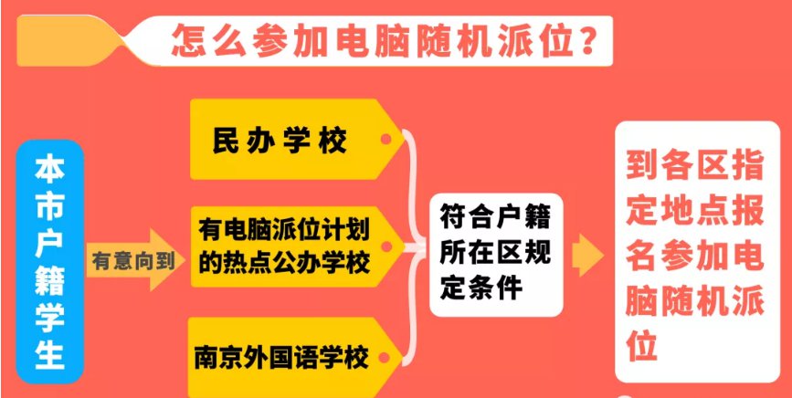 有意向到民办学校、有电脑派位计划的热点公办学校、南京外国语学校就读的本市户籍学生,如符合户籍所在区规定条件,可到各区指定地点报名参加电脑随机派位。电脑随机派位志愿须符合本人户籍和学校招生范围相关规定。