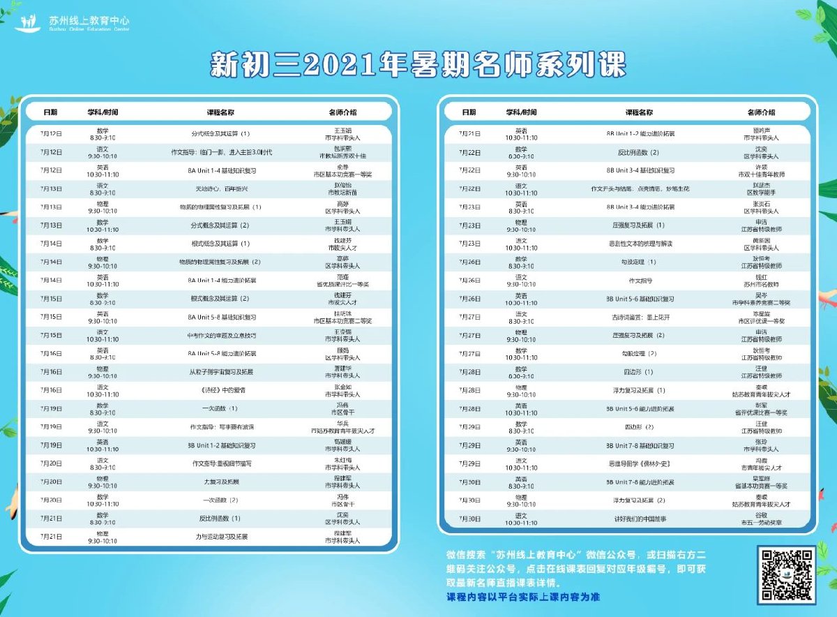 2021年苏州线上教育中心暑期直播课初二升初三课表