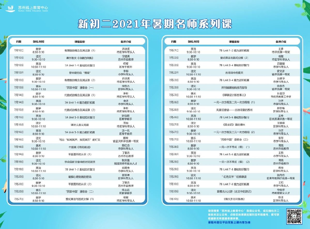 2021年苏州线上教育中心暑期直播课初一升初二课表