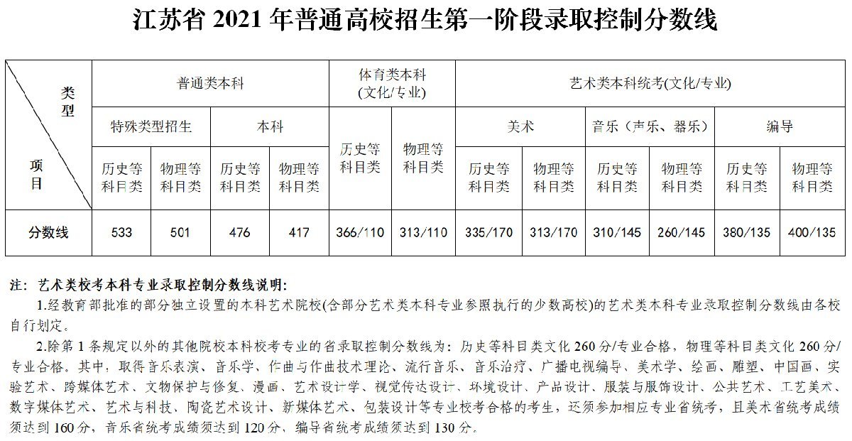 【2021年江苏新高考体育类本科分数线】