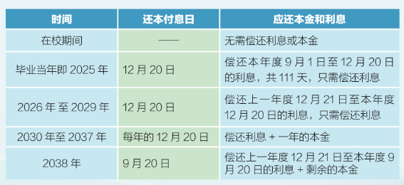 2、自您毕业(或结业)当年起,开始自己偿还助学贷款利息,还款日为每年的12月20日(最后一年为9月20日),遇节假日不顺延。