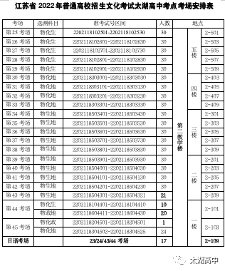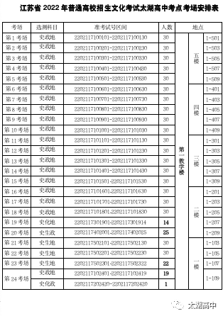 江苏省2022年普通高校招生全国统一考试将于6月7日至9日进行,江苏省太湖高级中学考点共设46个考场,5个隔离考场,2个备用考场。考试科目为语文、数学、外语、物理、历史、化学、地理、思想政治和生物。