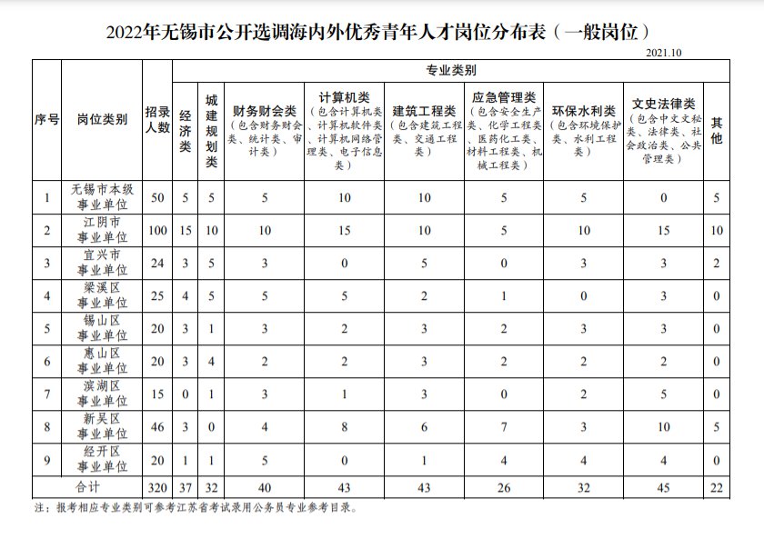 面向国内高校和国(境)外世界名校(2022年度THE世界排名前200强高校),选调455名优秀青年人才到无锡市各级事业单位工作。