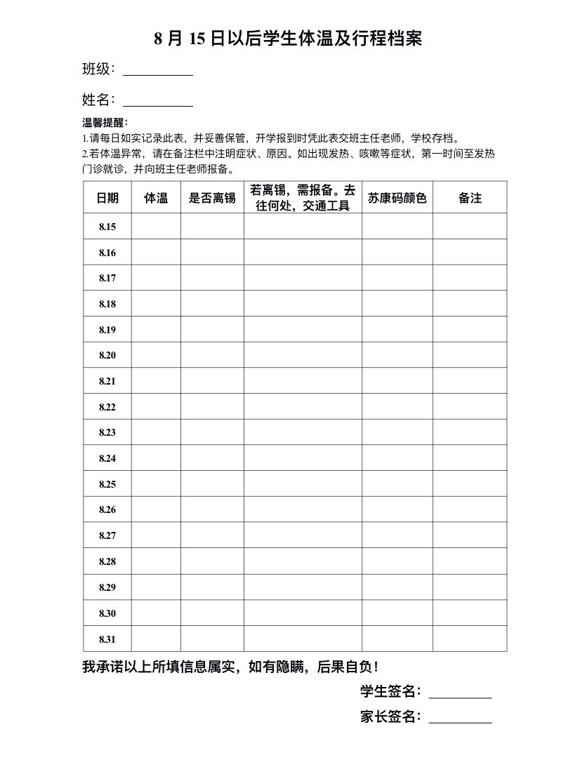 2.自8月16日起,所有学生每天做好居家自我观察和体温检测,并做好记录,开学报到时,将体温记录表上交班主任老师,统一存档。