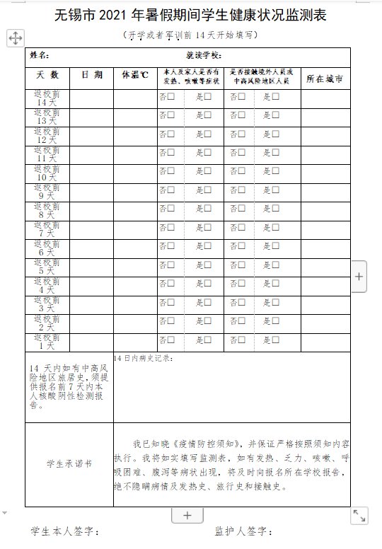 无锡市2021年暑假期间学生健康状况监测表格式》》》点击下载