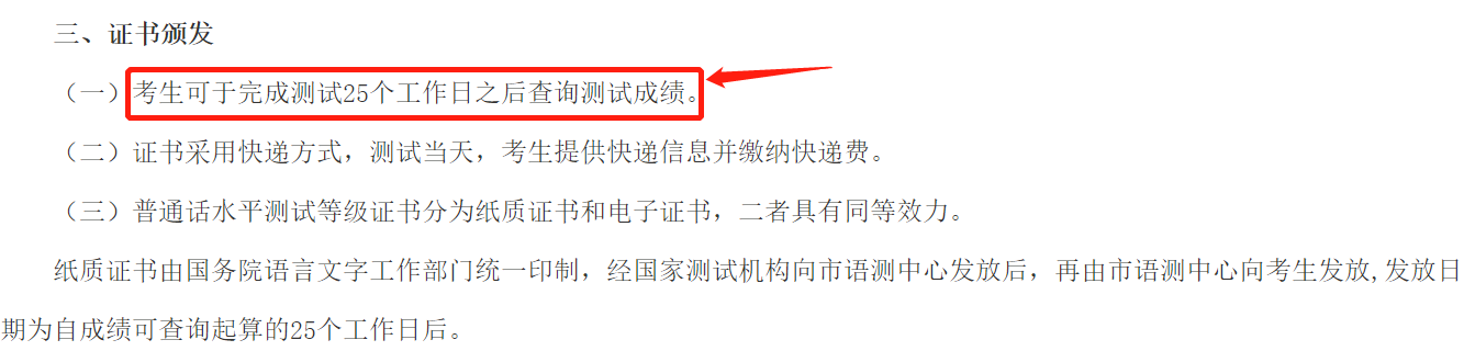 纸质证书由国务院语言文字工作部门统一印制,经国家测试机构向市语测中心发放后,再由市语测中心向考生发放,发放日期为自成绩可查询起算的25个工作日后。