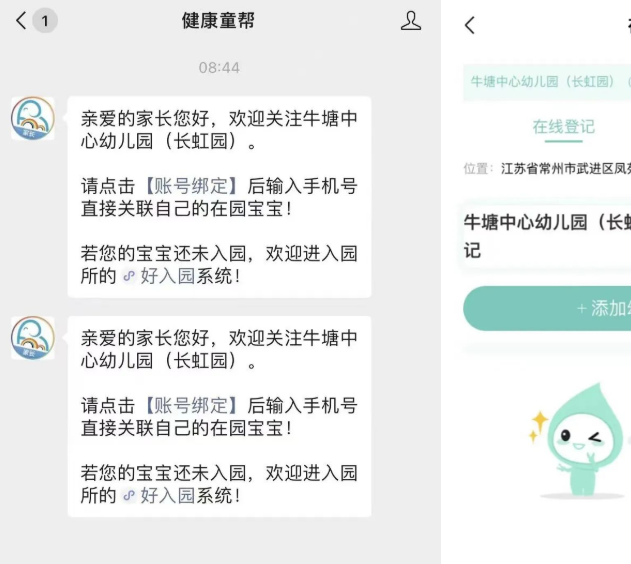 第一步:微信扫码进入“健康童帮”平台,关注"武进牛塘中心幼儿园(长虹园)"。