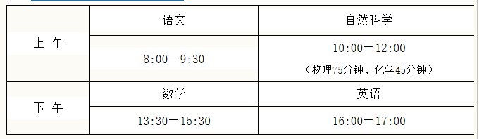 ②测试科目:数学(满分150分)、语文(满分120分)、英语(满分60分)、自然科学(满分150分:物理90分、化学60分)。