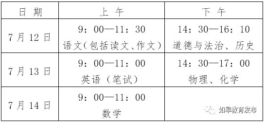 文化科目考试由南通市教育局统一命题、统一考试、统一阅卷。今年文化科目考试日期定于7月12日、13日、14日三天。具体安排如下: