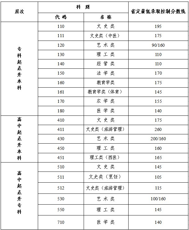 江苏省2021年成人高校招生最低录取控制分数线