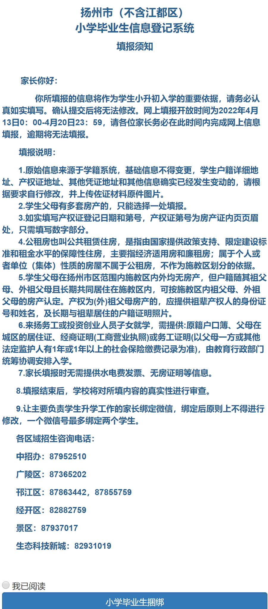 2022年扬州市城区(不含江都区)小学毕业生信息网上填报: