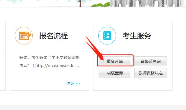 第一步:进入“中小学教师资格考试网”首页,在“考生服务”专栏,点击“报名系统”