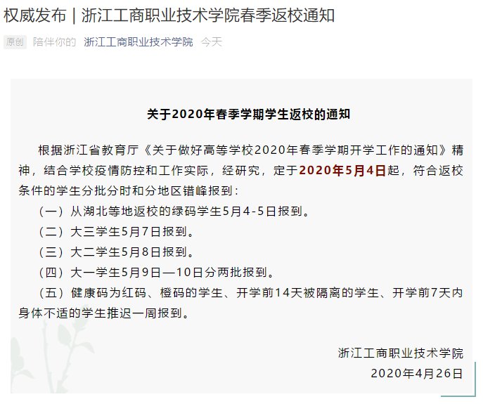 根据浙江省教育厅《关于做好高等学校2020年春季学期开学工作的通知》精神,结合学校疫情防控和工作实际,经研究,定于2020年5月4日起,符合返校条件的学生分批分时和分地区错峰报到: