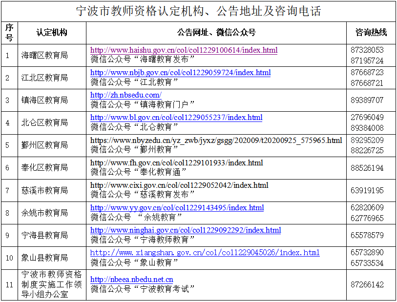 业务咨询:为方便申请人在网报前后咨询教师资格认定工作相关政策,宁波市教师资格制度实施工作领导小组办公室和区(县、市)教师资格认定机构通过网站、微信公众号发布教师资格认定公告,并开通咨询电话,为申请人提供全面的咨询服务,解答教师资格认定报名期间各类问题(具体咨询电话详见下表)。