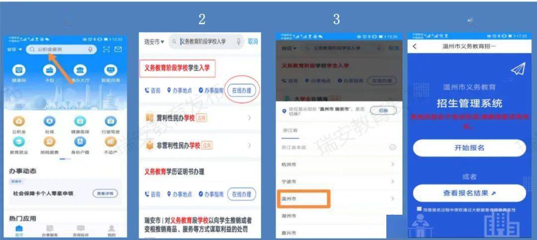 方法一入口:1.打开“浙里办”手机APP,用事先在“浙江政务服务网”注册的账号和密码登录系统,在首页面顶部中间搜索框内输入“义务教育阶段学校学生入学”;在检索结果中选择“义务教育阶段学校学生入学”这一行,点击“在线办理”;选择“浙江省-温州市-瑞安市”进入系统,再根据提示进行信息填报。