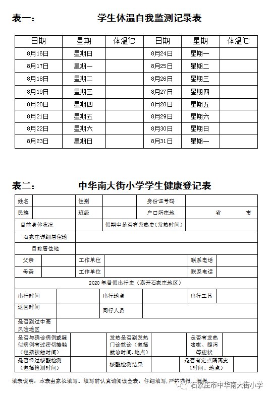 请全体学生坚持每天的健康监测,如实记录体温,开学时需向学校提交《体温自我监测记录表》。(见附表一)
