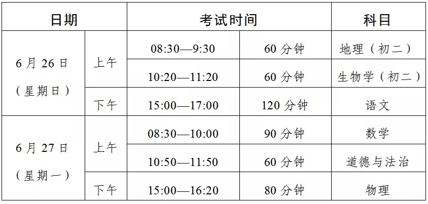 体育与健康、音乐、美术、信息技术等科目及物理、化学、生物实验操作等初中学业水平考试的具体时间,由各地市根据本地实际情况确定。非委托省命题地市初中学业水平考试时间,由相关市自行确定。