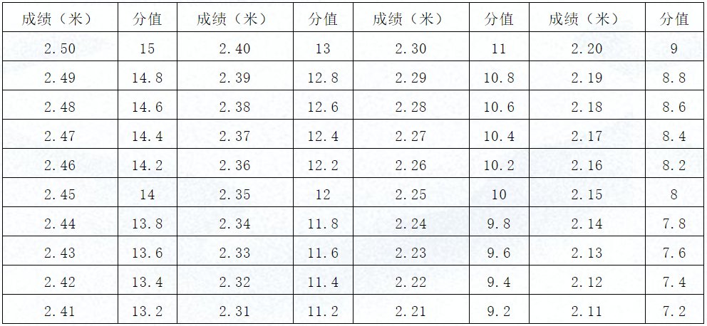⑴评价方法:考生两脚原地站立起跳,不能有预跳或踩线,以身体任何部位着地最近点为测量点,每人测试2次,取最好成绩。