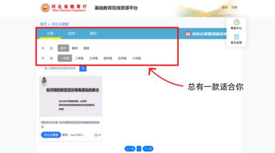 第二步:学生根据河北云课堂课程安排表的课程,在课程详情页面,通过条件筛选或查找展示符合条件的课程。