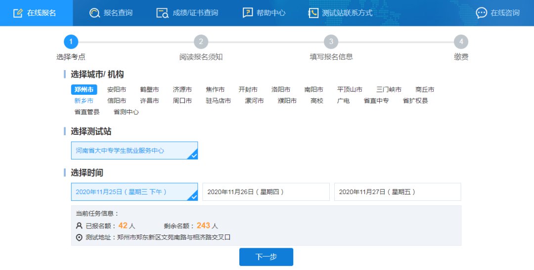选择考点,会有当前任务信息及“剩余名额”,可以就近选择自己家附近的测试站,点击“下一步”。