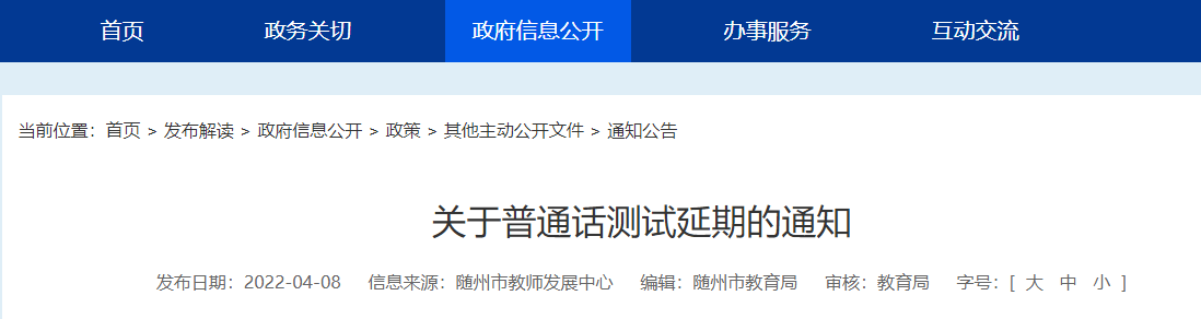 为贯彻落实省、市关于疫情防控部署要求,切实做好疫情防控工作,保障广大普通话考生和考务工作人员的身体健康。经报省测试中心研究同意,原定于2022年4月15日—18日在湖北现代教育学校(白云公园旁)举行的普通话测试延期,具体测试时间另行通知。