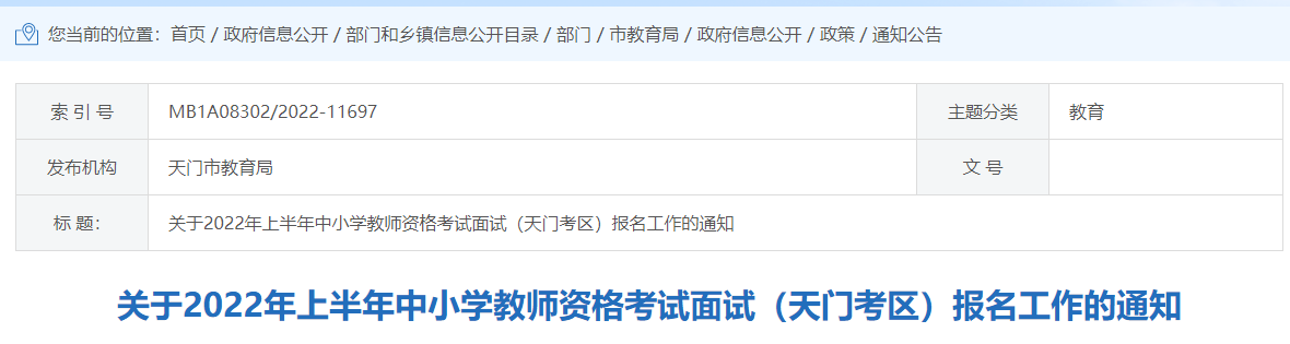2022年上半年中小学教师资格考试面试(天门考区)报名工作的通知