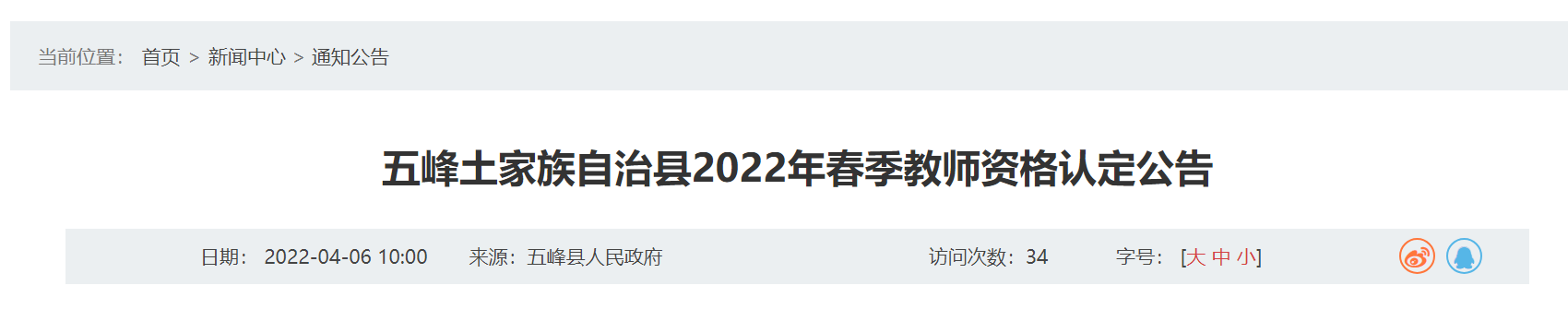 2022宜昌五峰教师资格证认定公告